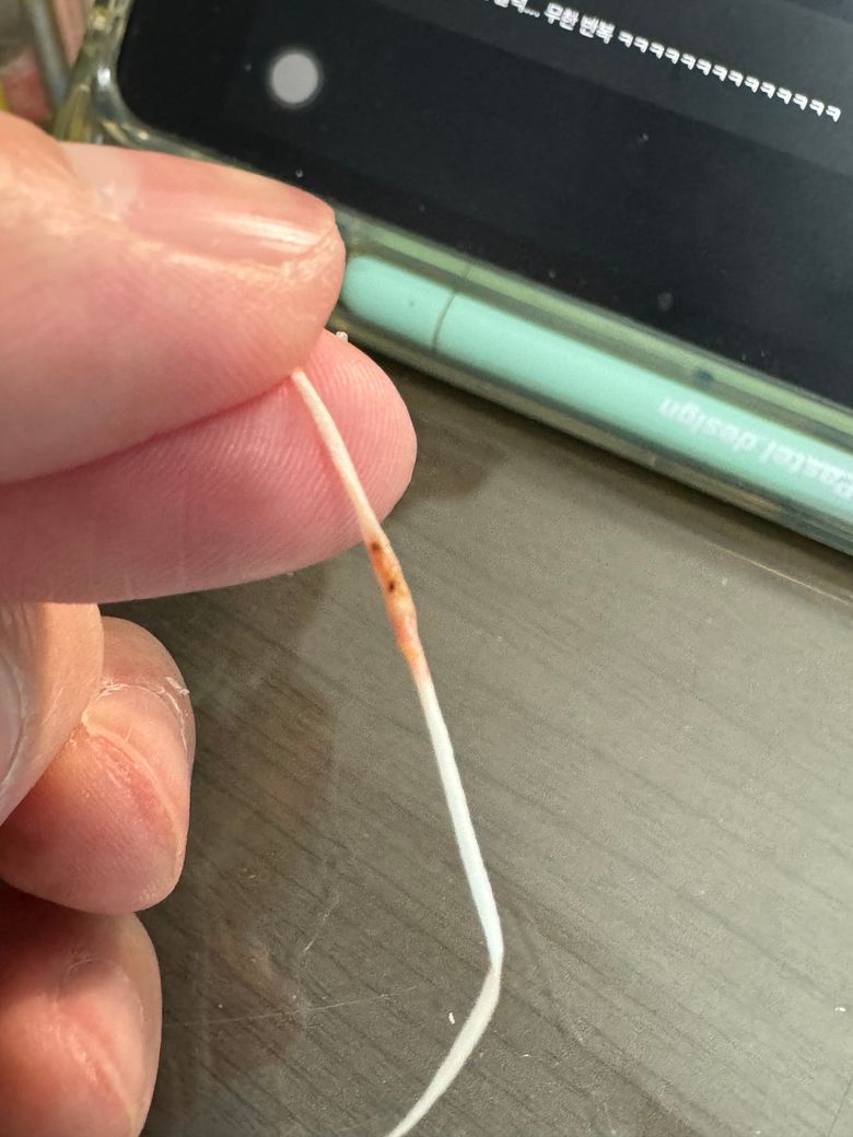 방금 치실을 했는데 피랑 같이 이런게 묻어나왔어요. 음식물이 부패돼서 검정색이 된 걸까요 아니면 썩은 게 떨어져 나온 걸까요.. 냄새 맡아봤는데 마치 편도결석 냄새까진 아니지만 비슷한 느낌이라 좋진 않네요.