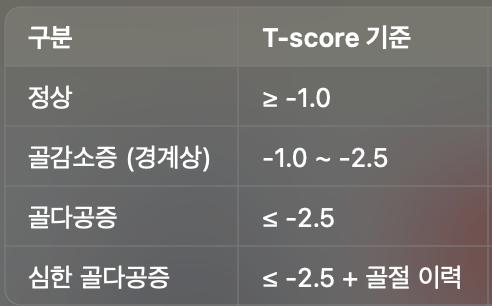 진단시 골다공증 기준은 BMD 검사를 통해 진단하며, T-score 기준으로 합니다.
