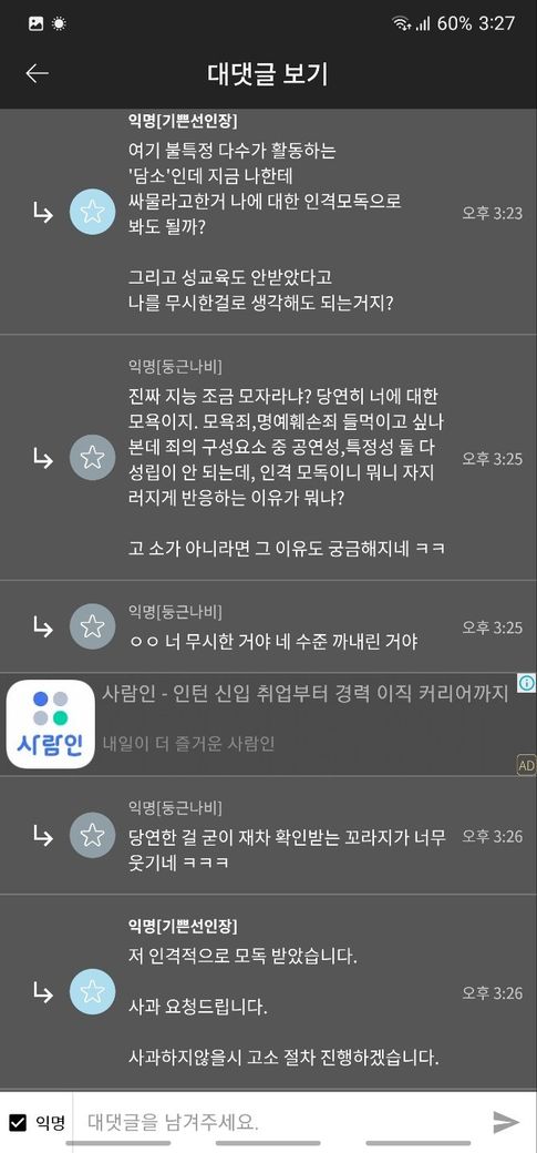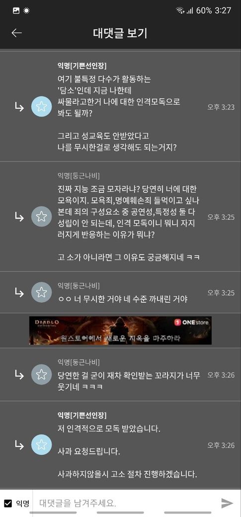 익명의 공간에서 이루어지는 행위에 대해서는 상대방을 특정하기 어렵기에 모욕죄 등 범죄가 성립하기 어렵습니다.