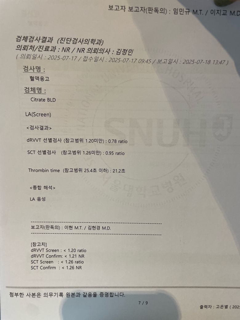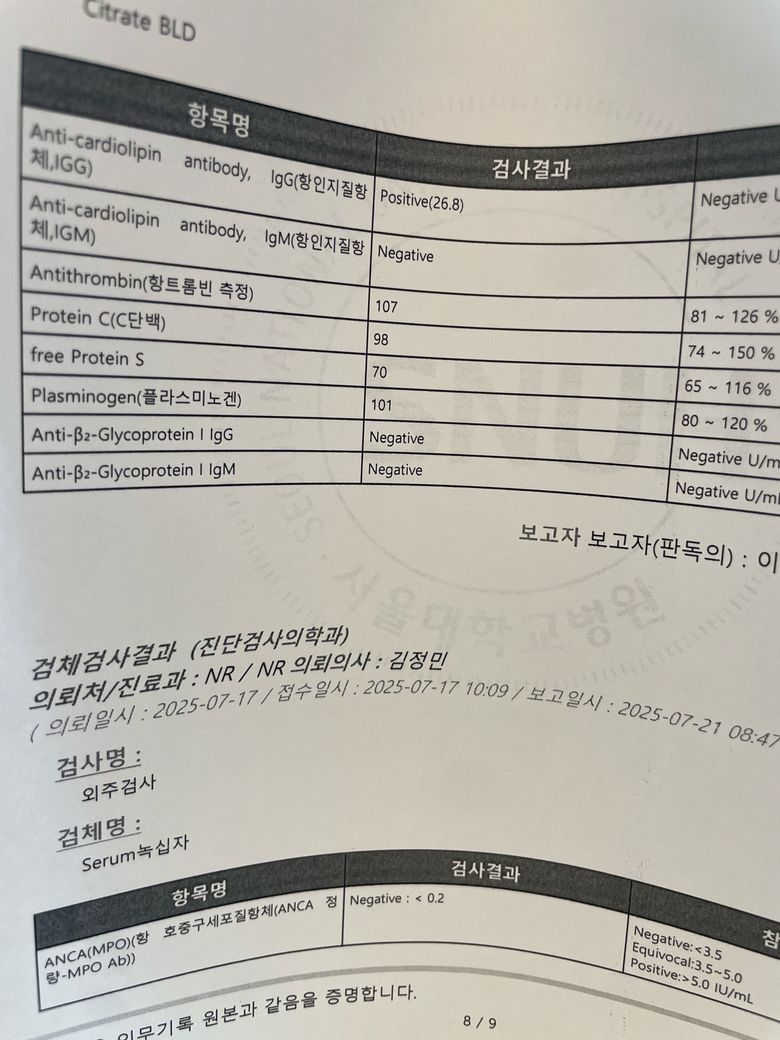 Anti-cardiolipin Ab 에서 양성이 나왔는데, 이는 항인지질 증후군 가능성 있어 보입니다.