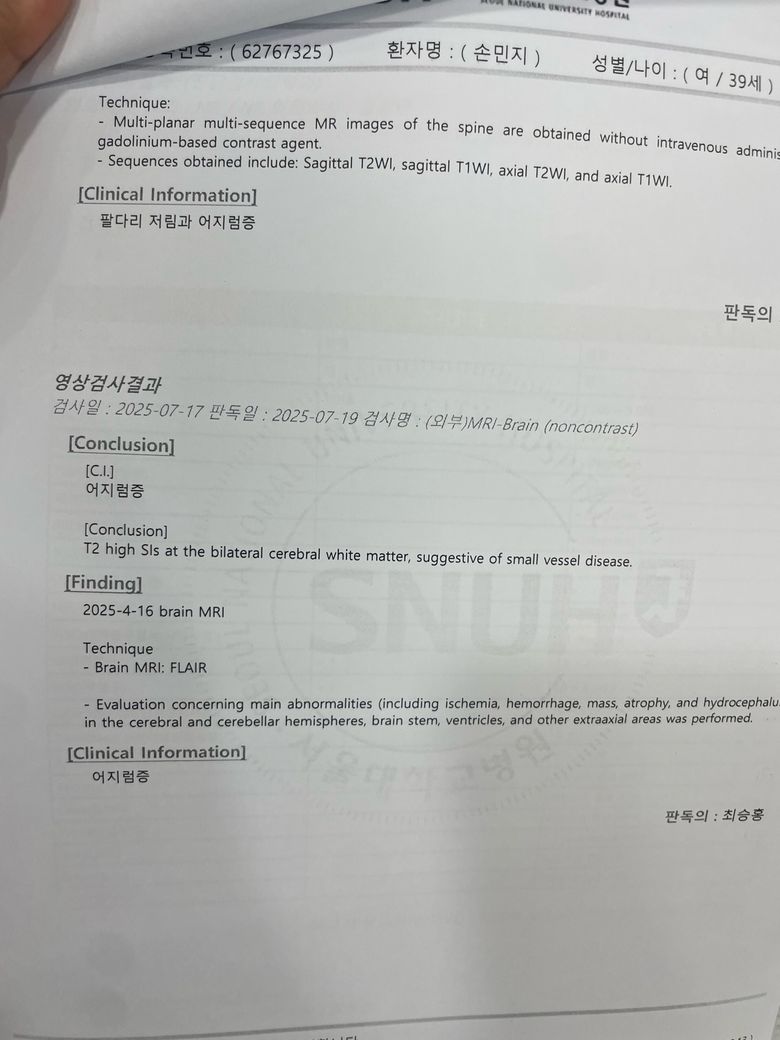 만39세 여자 이고 혈압 당뇨 비만 고지혈증 다 해당 사항 없는 상태에서 디스크로 인한 어지러움과 저림 증상으로 보고 살다가 우연히 찍은 건강 검진 뇌 mri 에서 백질에 고강도 신호 소견이 나왔습니다.
