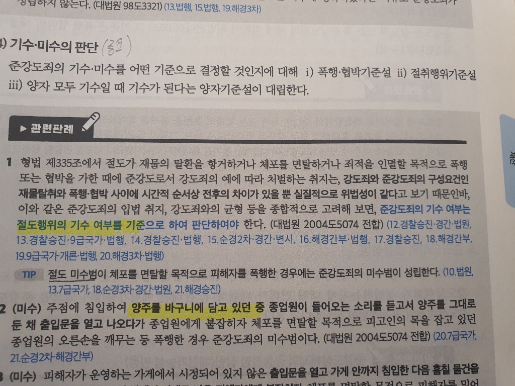 판례에서는 절도의 기수,미수를 기준으로 준강도의 기수 여부를 판단한다는 것입니다.
