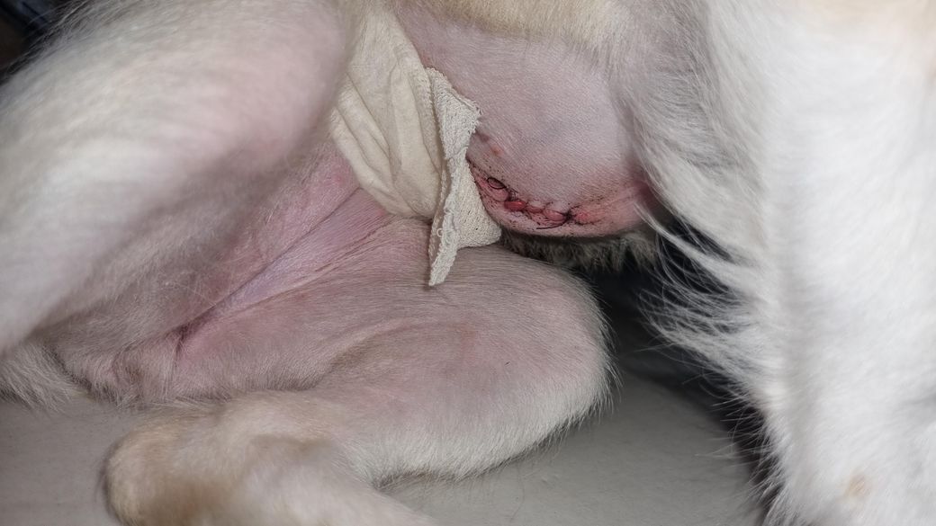(사진 주의)암컷 강아지 6월 10일에 중성화 수술 후 하루 입원하고 집에왔는데 보니까 붕대가 내려와서 수술부위가 노출돼있더라고요.. 혹시 다시 병원가서 붕대를 감아야할지 아니면 거즈로 직접 감아야 하는지, 셀프로 감아도되는건가요?? 아니면 이대로 괜찮나요?? 참고로