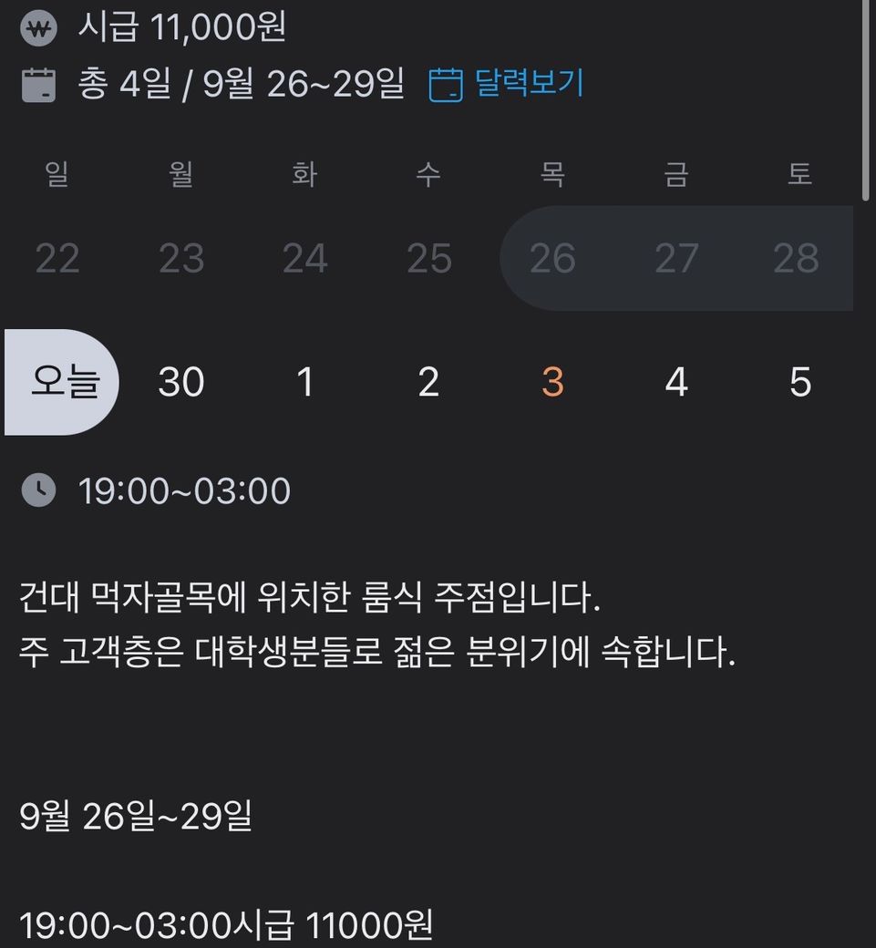 26일은 근무하지 않았습니다. 27일 19시~ 28일 3시, 28일 19시 ~ 29일 4시까지 근무했고, 29일 19시 ~ 30일 3시까지 근무 예정입니다. 제가 근무 시작할때는 근무자가 총 5인 이상이었고, 새벽 3시 이후에는 총 4인이었습니다. 이럴 경우 야간 수당을 받을 수 있는지와 28일은 연장근로수당을 받을 수 있는지, 받을 수 있다면 총 얼마를 받게 되는지 궁금합니다. (단기알바라 근로계약서는 작성하지 않았습니다.)2개의 답변이 있어요!