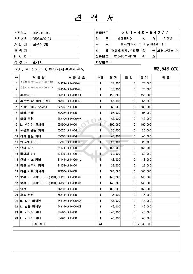오토바이 견적에 깜놀햇습니다. 너무나 터무니없네요