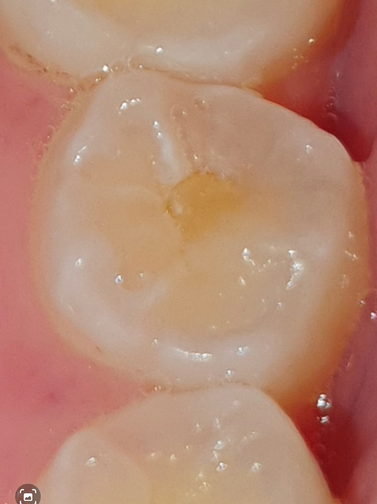깊지 않은 충치로 보여집니다. 굉장히 진행이 느린 충치로 볼 수 있으나 정확한 건 방사선 사진을 찍어봐야 알 수 있습니다. 충치보다도 전반적으로 치아의 뾰족한 부분(교두)이 다소 마모가 진행된 것으로 보입니다. 아주 고령이 아니라면 치아를 꽉 깨무는 습관, 이를 가는 습관을 지양하고