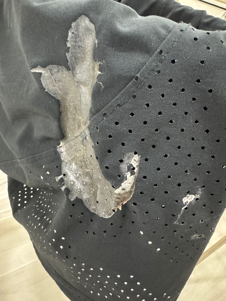 다른 옷들과 빨래를 했는데 해당 제품의 의류만 손상이되어 질문 드립니다. 단단하고 잘 떨어지지도 않습니다. 불에타서 쪼그라든것처럼 변형되었는데 뭐가 묻은건지 잘 모르겠습니다. 무엇때문인지 알려주시면 감사하겠습니다