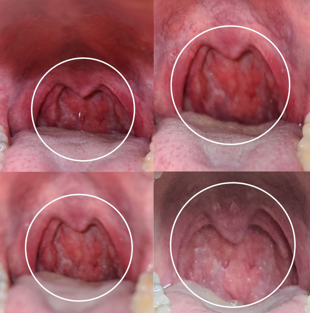 약간의 발적과 충혈이 보여 인두부의 염증을 의심할 것으로 보이는데, 이는 역류성 식도염(혹은 인후두염)이나 비염으로 인한 후비루 등을 의심케합니다. 가까운 이비인후과에서 진료를 받아보시기 바랍니다.