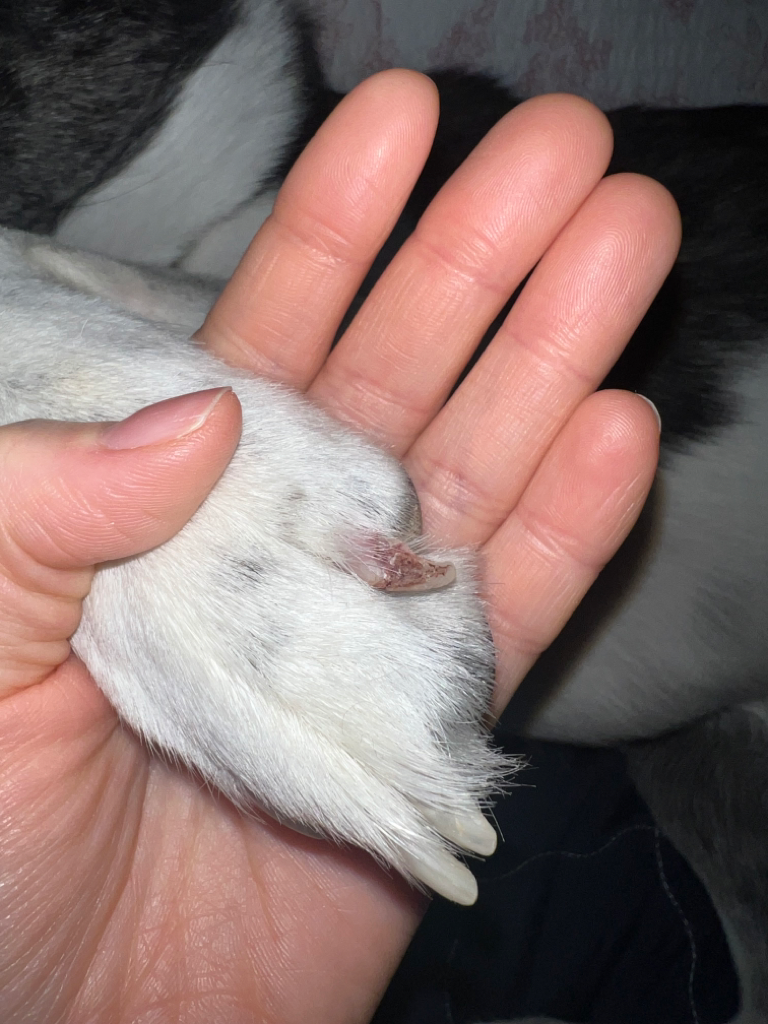 부러진 상태로 판단됩니다. 덜렁거리거나 하여 주변 옷이나 걸리는것에 걸리게 되면 발톱과 발가락 관절에 심각한 손상이 일어날 수 있으니 우선 동물병원에 데려가서 이상 평가를 받아 보시는걸 추천합니다.