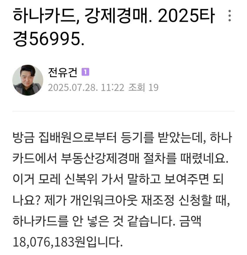 반갑습니다. 저는 전유건이라고 합니다. 3시간 전에 집배원으로부터 등기를 받았는데, 하나카드에서 부동산강제경매 절차를 때렸네요. 이거 모레 신복위 가서 말하고 보여주면 되나요? 제가 개인워크아웃 재조정 신청할 때, 하나카드를 안 넣은 것 같습니다. 금액 18,076,183원입니다. 그리고 현대카드도 같은 경우입니다.