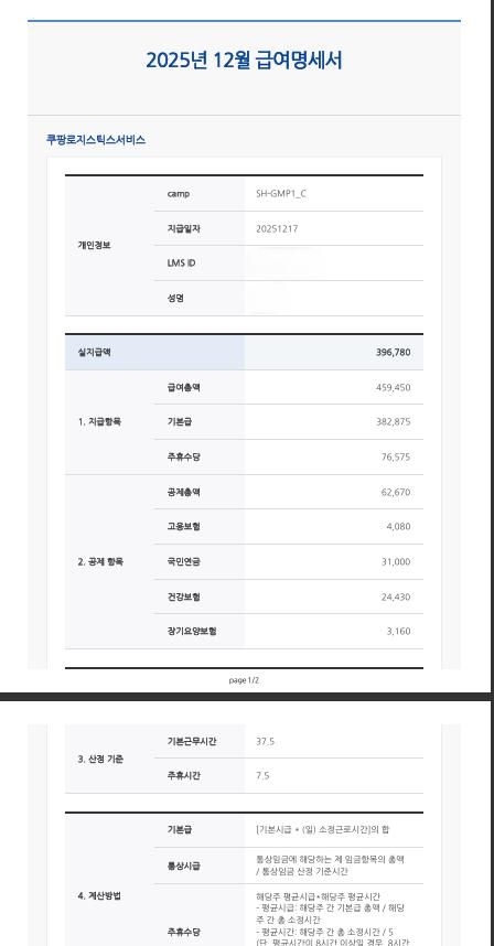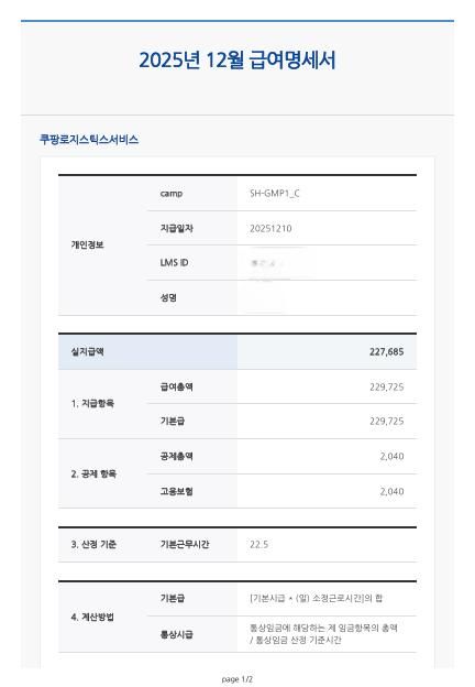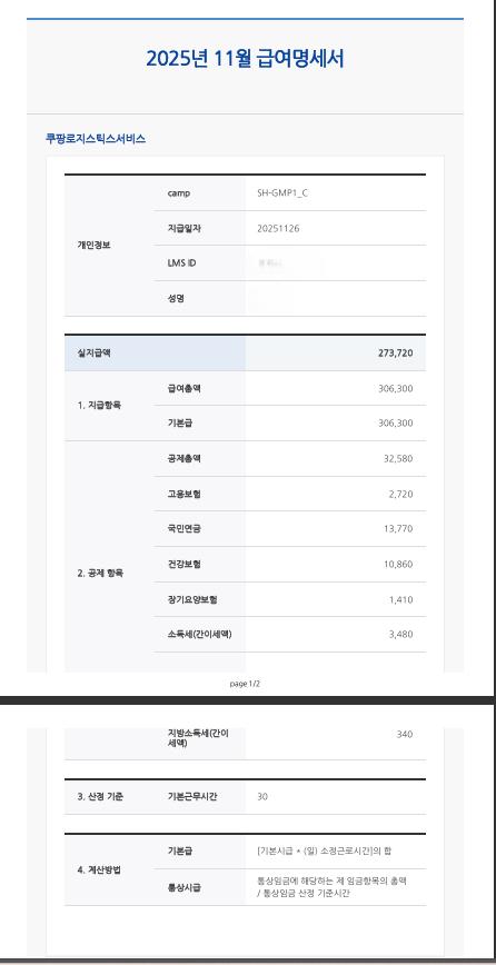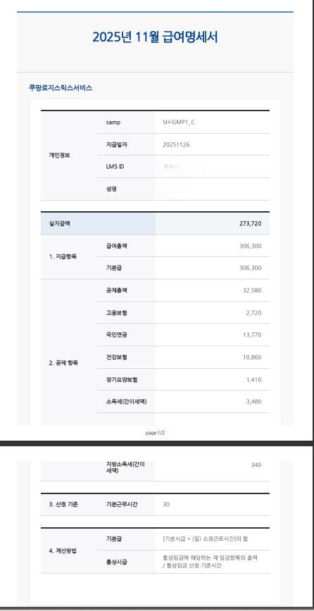 제가 25년 8월 24일부터 쿠팡풀필먼트에서 일용직으로 일하기 시작했는데요. 시급 10210원×일 근무시간 7.5시간=