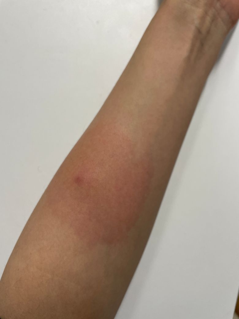 몇일 전 피부에 피지 같은 것이 올라와있었는데 살짝 만지니 빠져나왔습니다. 그런데 그 다음 날부터 팔 피부가 이렇게 빨갛고 약간 부풀어 있는데 왜이럴까요? 처음에는 열감도 있고 통증도 있엇는데 지금은 없습니다. 가운데 부분 색이 조금 진한 곳을 중심으로 엄지손톱정도의 범위가 조금 더 단단합니다.