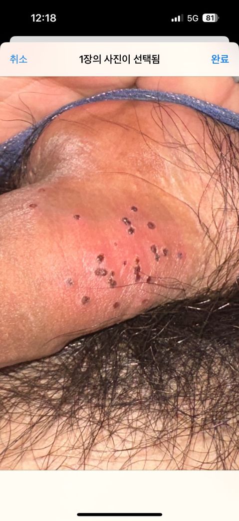 4일 전에 샤워하면서 밑에가 따끔거려서 보니까 껍질 부분이 까진듯 한 상처와 검정색 딱지같은 부분이 보이더라구요 수포를 발견한 적은 없었습니다..