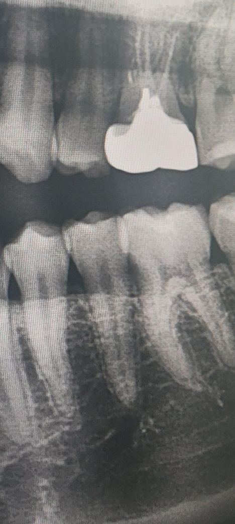 현재 엑스레이 사진상으로는 특별히 뿌리 끝에 염증이 있다던지 병적인 소견은 없습니다. 정확한 건 치과가서 체크해보시기 바랍니다.
