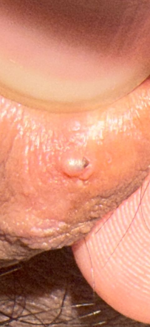 사진상 수포성 병변으로 보이는데 통증이 동반되어 있다면 농포 가능성도 고려해야 합니다. 사진상으로 두가지 감별이 명확하지는 않습니다. 인위적으로 짜낼 경우 이차 세균 감염이 발생할 수 있어 짜내는 것은 권하지 않습니다. 단일 병변이라면 헤르페스 감염의 가능성은 낮으며 곤지름에서 관찰되는 사마귀 양상의 병변이 아니므로 성매개성 감염 질환 가능성은 낮을 것으로 판단됩니다. 병변이 지속될 경우에는 비뇨의학과 진료를 권해드립니다.