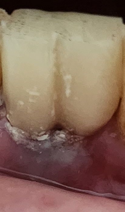 안녕하세요. 뼈이식과 임플란트 식립 3개월 후, 어제 다시 잇몸을 절개하여 지주대를 세우고 임시치아를 부착했습니다. 임플란트 뿌리만 식립하고 회복하는 동안 핑크 빛으로 예쁘게 아물어 있었는데, 어제 지주대 시술 및 임시치아 부착 후 잇몸이 사진과 같이 회색빛으로 보입니다. 잇몸이 부족해서 지주대나 뿌리가 비치는 걸까요? 잇몸에 염증이 생긴걸까요? 통증은 없으십니다.