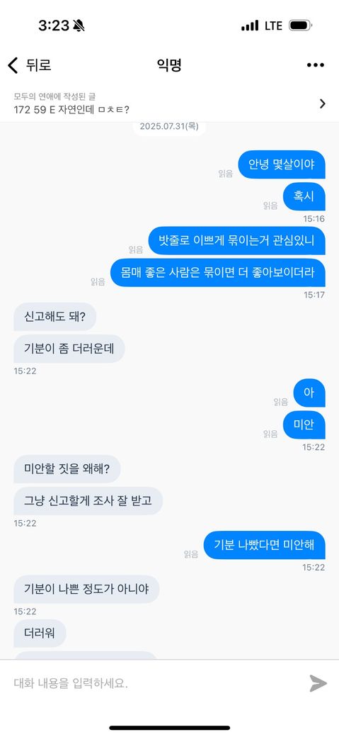 상대방이 기분이 나쁘다는 의사를 보여서 사과를 했는데 신고를 하겠다고 해서 현재 차단한 상태입니다.