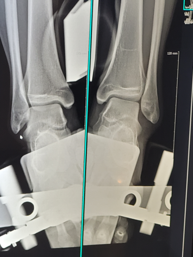 스트레스 뷰에서 보이는 벌어짐은 거골과 중골, 비골 사이 관절 간격이 넓어진 것입니다. 이는 주로 전거비인대와 종비인대가 손상되었을 때 나타납니다. 즉 거골이 외측으로 밀리면서 거골~비골 간격이 정상보다 벌어진 모습으로 해석할 수 있습니다.