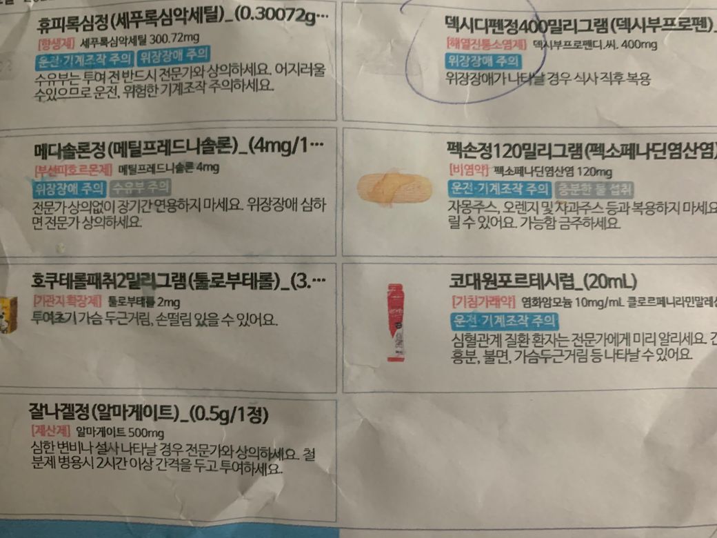처방받으신 약 목록을 보시면 항생제(세푸록심), 스테로이드(메틸프레드니솔론), 비스테로이드성소염제(덱시부프로펜)이 있습니다.