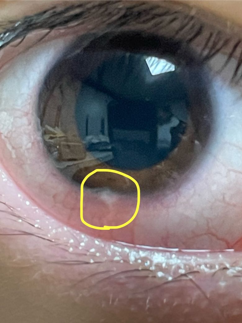 홍채 근처에 점액질처럼 보이는 작은 흰색 병변이 관찰되는데 육안 소견으로 보았을 때는 안과적 질환 가능성은 낮아 보입니다. 특히 통증이나 주변부 각막이나 결막의 충혈과 같은 동반 증상이 없다면 문제가 되는 경우는 흔하지 않습니다. 이물감이나 통증 등이 없다면 1~2주 정도 경과를 살펴보시고 증상이 나타나거나 상기 병변이 변화가 있다면 안과 진료를 보시는 것을 권해드립니다.