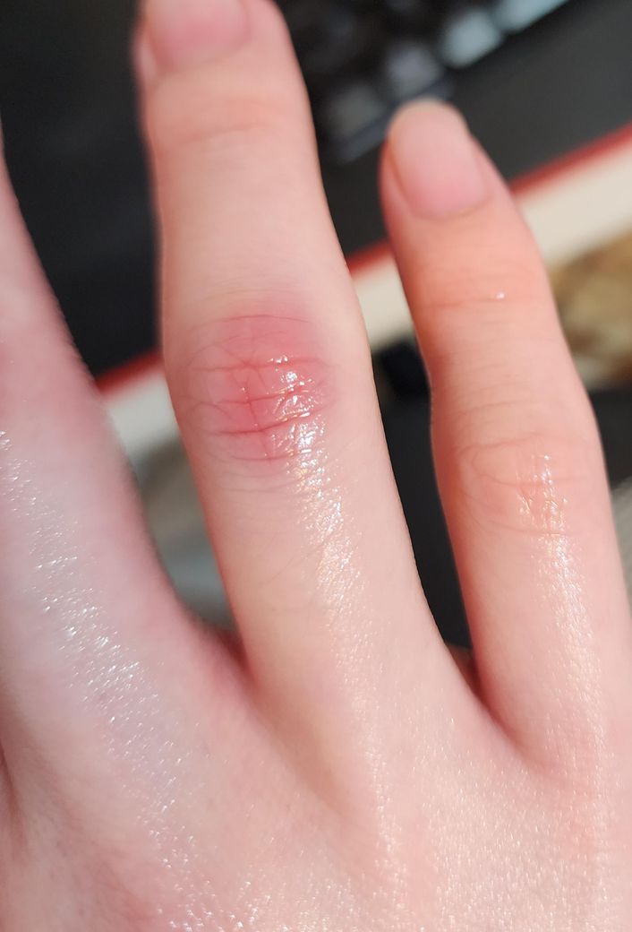 설명해주신 증상으로 보아, 배구 서브 중 손가락에 반복적으로 강한 충격이 가해져 타박상이 생긴 것 같고, 그 과정에서 피부가 약간 까지고 출혈이나 멍(혈종)이 생긴 듯합니다. 손가락이 잘 움직이고 극심한 통증이나 붓기, 변형이 없다면 골절 가능성은 낮아 보여요.