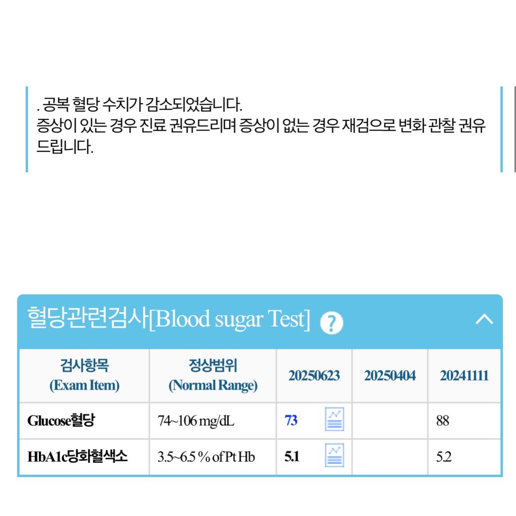 공복에서 73mg/dL 정도의 수치는 건강한 것이 맞습니다.