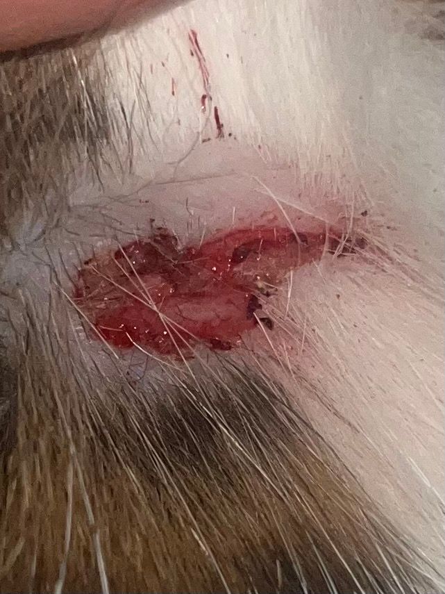 털이랑 피딱지가 진 뭉치가 보여 찾아봤는데 목 쪽에 저런 상처가 있어요 어디가 아픈 건지, 어쩌다가 생긴 건지 유추할 수 있을까요? 강아지 한마리가 있는데 싸우다가 그런 상처인지 궁금합니다
