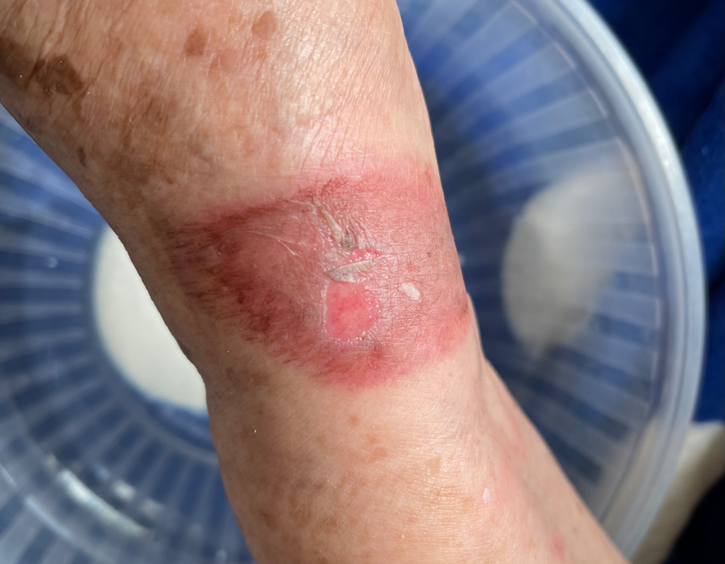 사진으로 보이는 부위는 화상에 의한 손상을 보이고 있으며, 적절한 치료 절차를 밟고 계신 것 같습니다. 화상 치료는 개인의 건강 상태, 손상 정도, 화상의 위치와 깊이에 따라 치유 속도가 달라질 수 있습니다. 일반적으로 연세가 많으신 분들은 피부 재생 속도가 젊은 사람에 비해 느릴 수 있습니다.