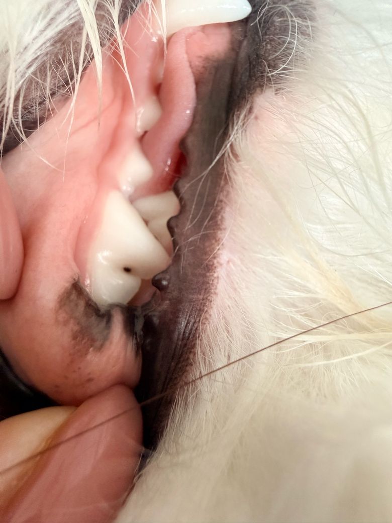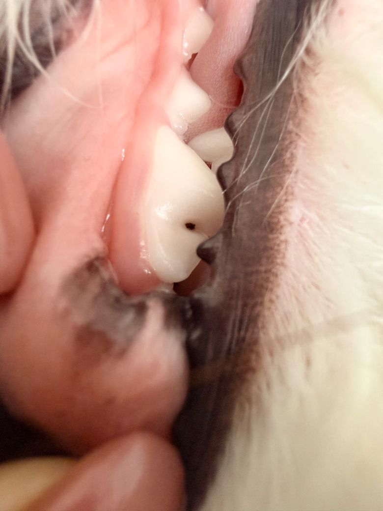 강아지의 치아에 보이는 검은 점은 충치일 가능성보다는 치아 파절로 인해 내부 상아질이나 신경관이 노출된 상태일 확률이 높습니다. 강아지는 사람과 달리 구강 구조상 충치가 잘 생기지 않으며, 딱딱한 뼈 간식을 자주 씹는 습관 때문에 치아 끝이 깨지면서 착색이 일어나는 경우가 빈번합니다. 육안만으로는 치수염 진행 여부를 판단하기 어려우므로 치과 방사선 촬영이 가능한 동물 병원을 방문하여 신경 손상 정도를 확인하고 적절한 치료를 받는 것이 권장됩니다. 치료 없이 방치할 경우 뿌리 염증이나 통증으로 이어질 수 있으니 전문가의 진단을 받아보시기 바랍니다.