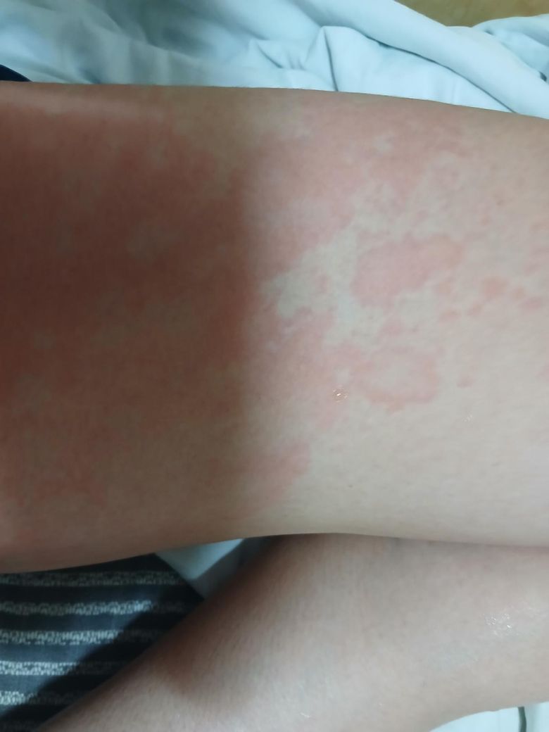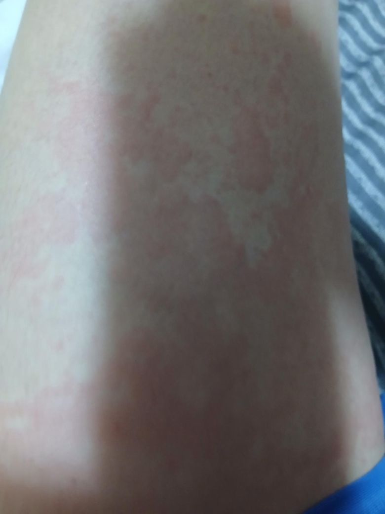 올려주신 사진을 살펴보았고 사진상 넓적한 형태의 융기성 병변이 가려움을 동반하고 있어 두드러기와 같은 알러지 질환
