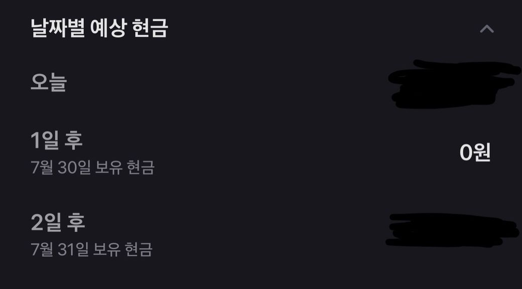 ㆍ 토스에서 오늘 , 1일 후 , 2일 후 등 날짜별로 예상 보유 현금을 표시합니다.