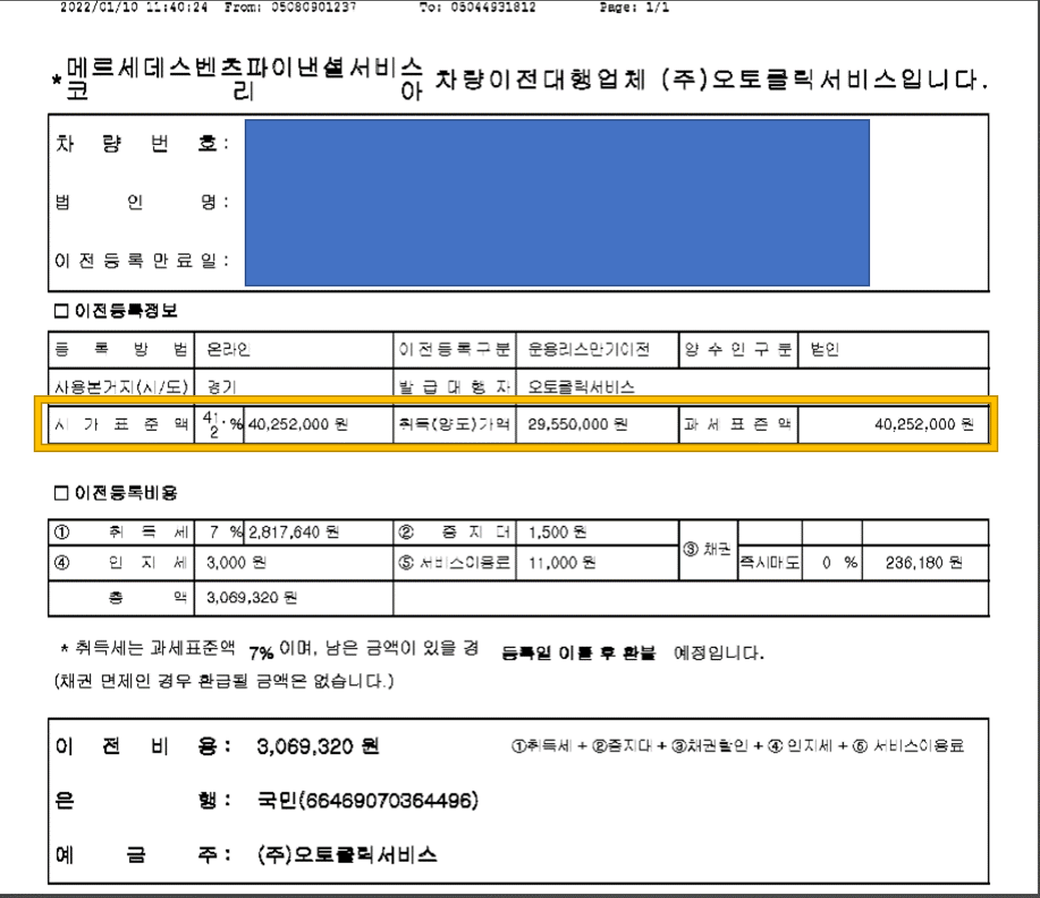 2. 계약서에 양도가액을 장부상 잔존가치로 해야 하는지, 공정가치(차량 이전 시 시가표준액이나 과세표준액 - 첨부그림 노락란색 박스)로 해야하는지 궁금합니다.