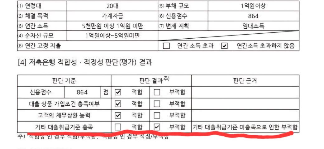 그런데 빨간밑줄 그어진 것처럼 '기타대출취급기준 미충족' 으로 거절이 됐네요. 이유가 뭘까요?