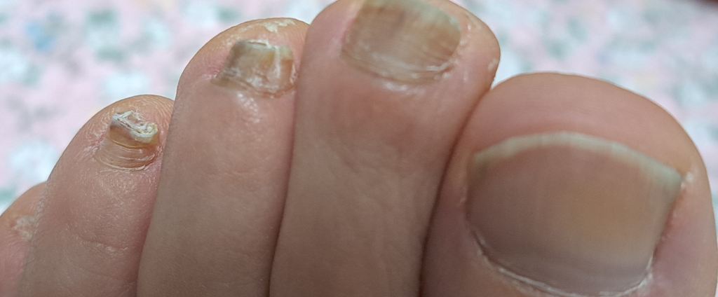 현재 발톱 무좀이 동반된 상태로 약물치료가 필요하겠습니다. 피부과 진료를 받으시기 바랍니다.