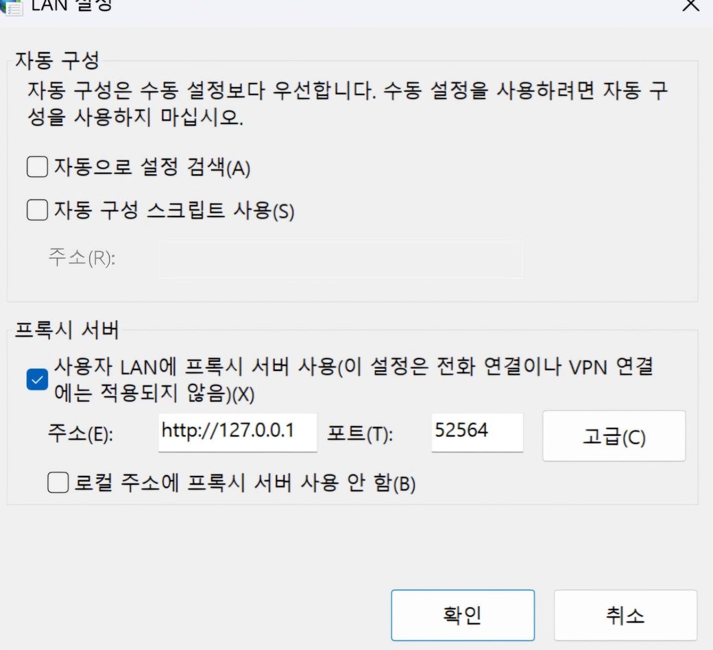 접속불가가 계속 떠서 LAN 설정을끄고 해결했는데