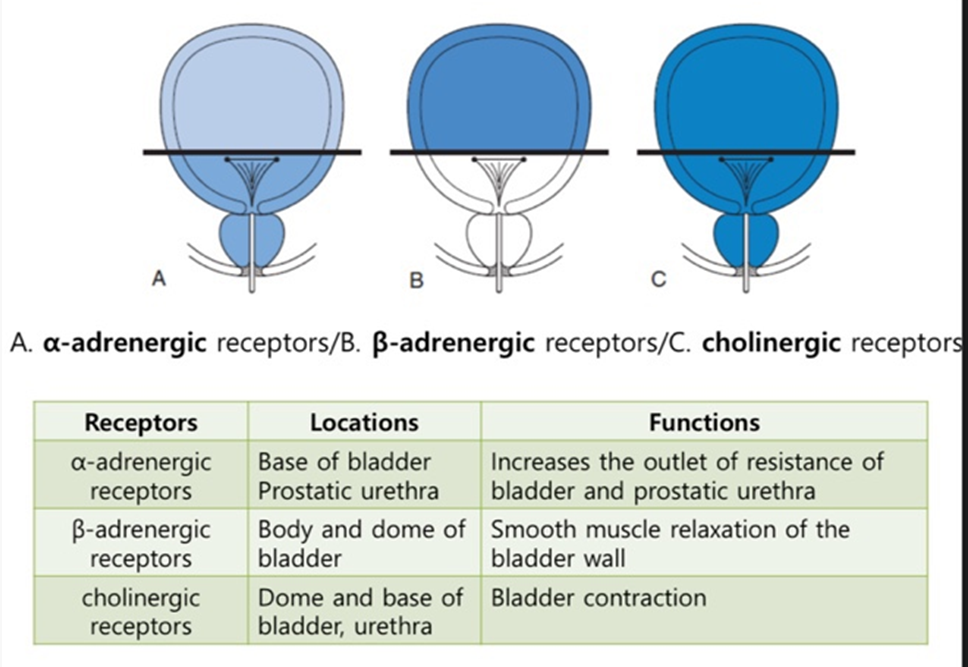 방광벽 근육의 입장에서 보면 교감신경 수용체로 베타 수용체가 있고 콜리널직 수용체가 있는데 교감이 작용하면 근육이 이완되고 부교감이 작용하면 근육이 수축한다고 보시면 되겠습니다.