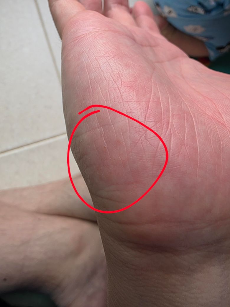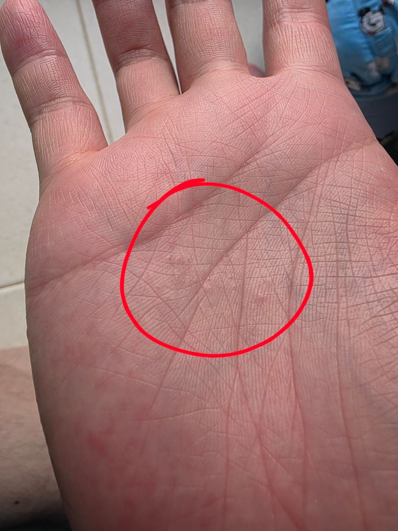 사진 속 손바닥에 붉은색 원으로 표시된 부위는 피부가 약간 거칠고, 작은 구진(오돌토돌한 돌기)이나 미세한 물집, 각질 등이 보입니다. 질문자님이 설명하신 “몇 년 전부터 손바닥 습진으로 고생했고, 알리톡(알리트레티노인) 처방, 스테로이드 연고와 핸드크림으로 관리 중 재발”이라는 병력과 현재 사진 속 증상은 전형적인 만성 수부 습진의 특징과 잘 맞습니다.