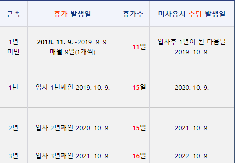 2019. 9. 9. ~ 2019. 10. 8. 근무시에는 근무기간이 1년이 되어 버리므로 더 이상 월단위 연차휴가 발생할 수 없고, 연단위 연차휴가 15일만 발생하는 것입니다.