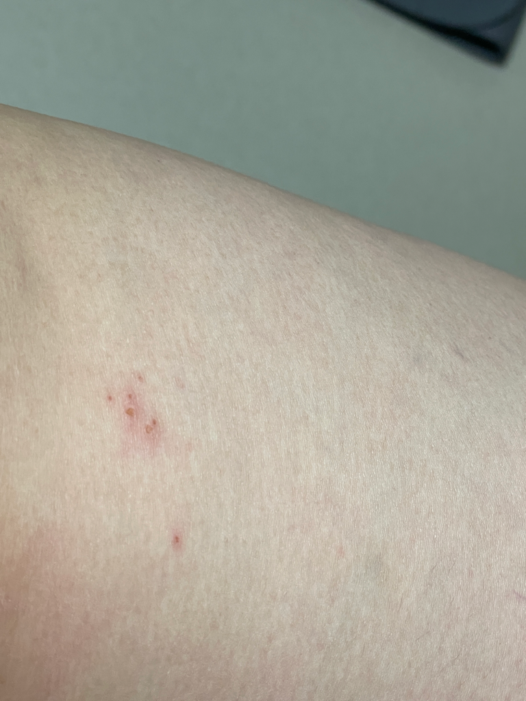 아직 병변이 작긴 한데 군집을 이루는 수포로 보이고 대상포진의 가능성도 있겠습니다. 통증이 느껴진다면 가까운 병원을 방문해 항바이러스제를 처방받으시는게 좋겠습니다.