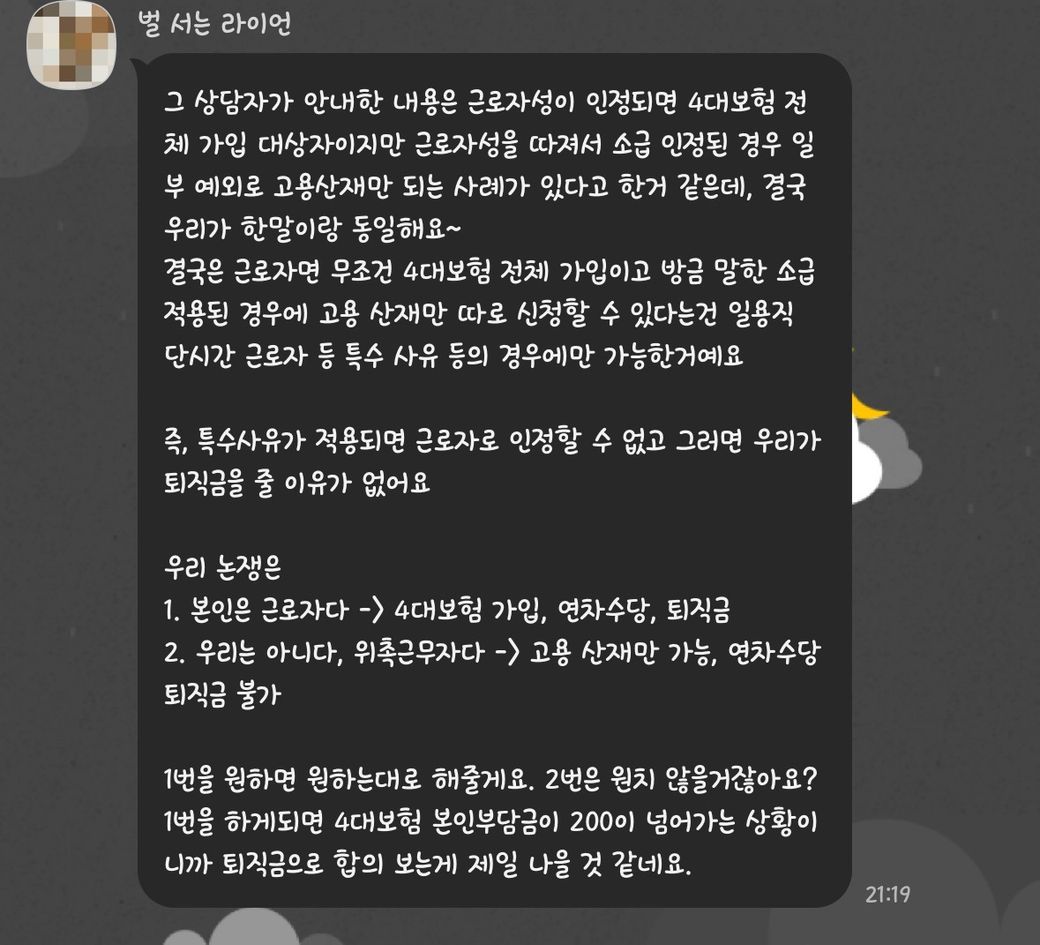 무엇보다 본인은 세금 탈루할 생각으로 가입이 의무인 4대보험을 안 들려고 하면서 본인에게 유리한 요소만 인정해달라고 하는 모습은 이율배반적인 모습이기 때문에 법원이든 노동위원회든 안 좋게 볼거 같네요