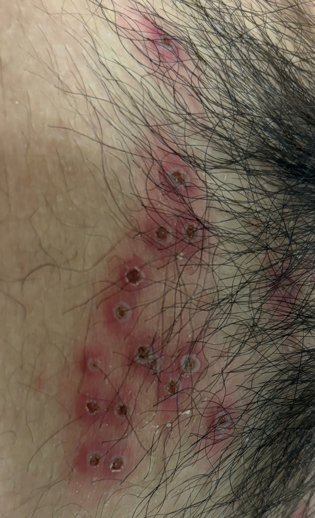 사진에 보이는 병변은 이미 긁어서 터지고 가피가 생겨서 이것만 보고 진단이 어렵습니다.