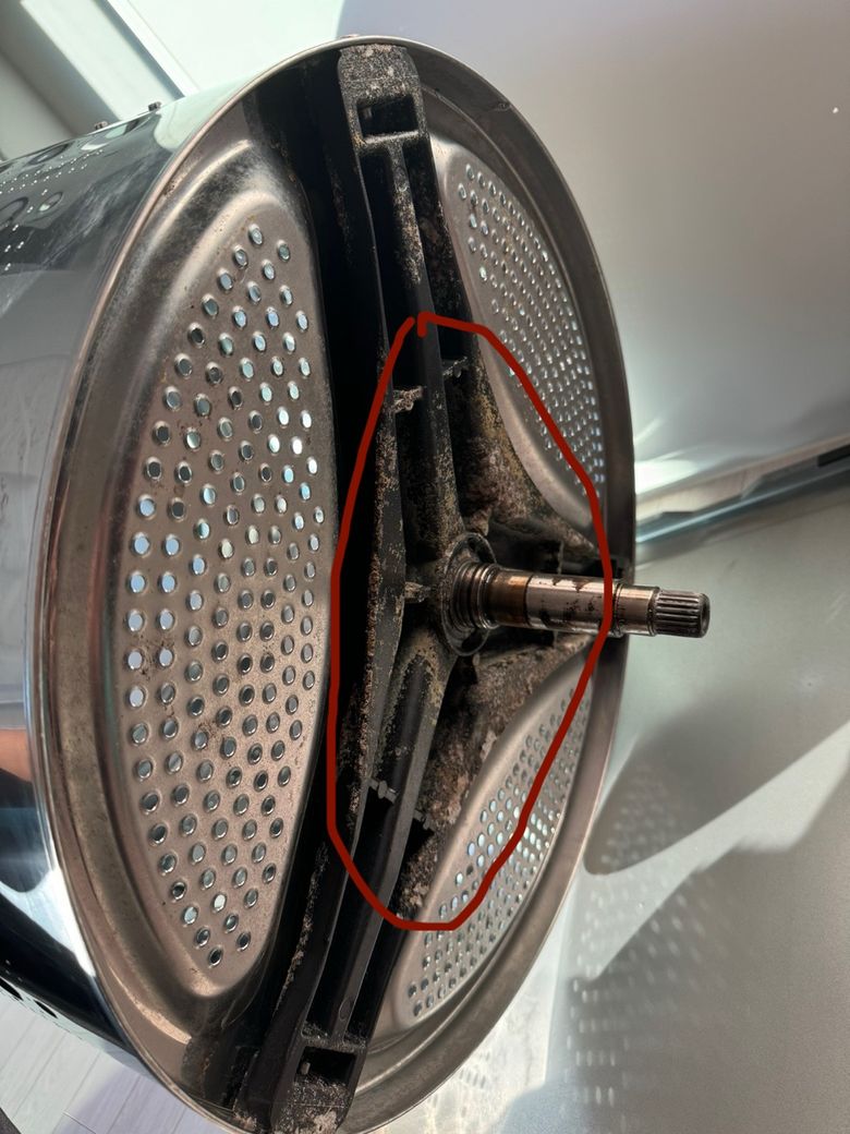 21년식 엘지 드럼세탁기 중고 구입을 했는데 고무파킹부터 곰팡이가 심해 엘지서비스 불러서 고무파킹 교체하고 하이마트 홈케어 서비스 불러 분해세척도 했어요. 그 후에도 세척시 검은 찌꺼기가 나와 기사님이 2번 더 오셔서 클리닝을 해주고 간 상태인데 그래도 나오네요. 통 밑에 삼지창같이 생긴 검은 분이 부식되어 페인트가 벗겨졌는데 그 페인트가 조금씩 딸려나오는 거라 하셨다던데 이런경우 방법이 없을까요? 기사님은 이제 많이 안나올거 같다고 하시고 가셨고 또 나오면 와서 또 청소해주시겠다 하셨는데 나올때마다 계속 부르기도 번거로운 일이고 이렇게 찌꺼기가 나오는 상황서 되팔수도 없고 돈은 이미 들어갔고 머리가 아프네요. 엘지 서비스에 전화해서 저 삼지창같이 생긴 부분만 교체가 가능할지 함 알아보려고 하는데