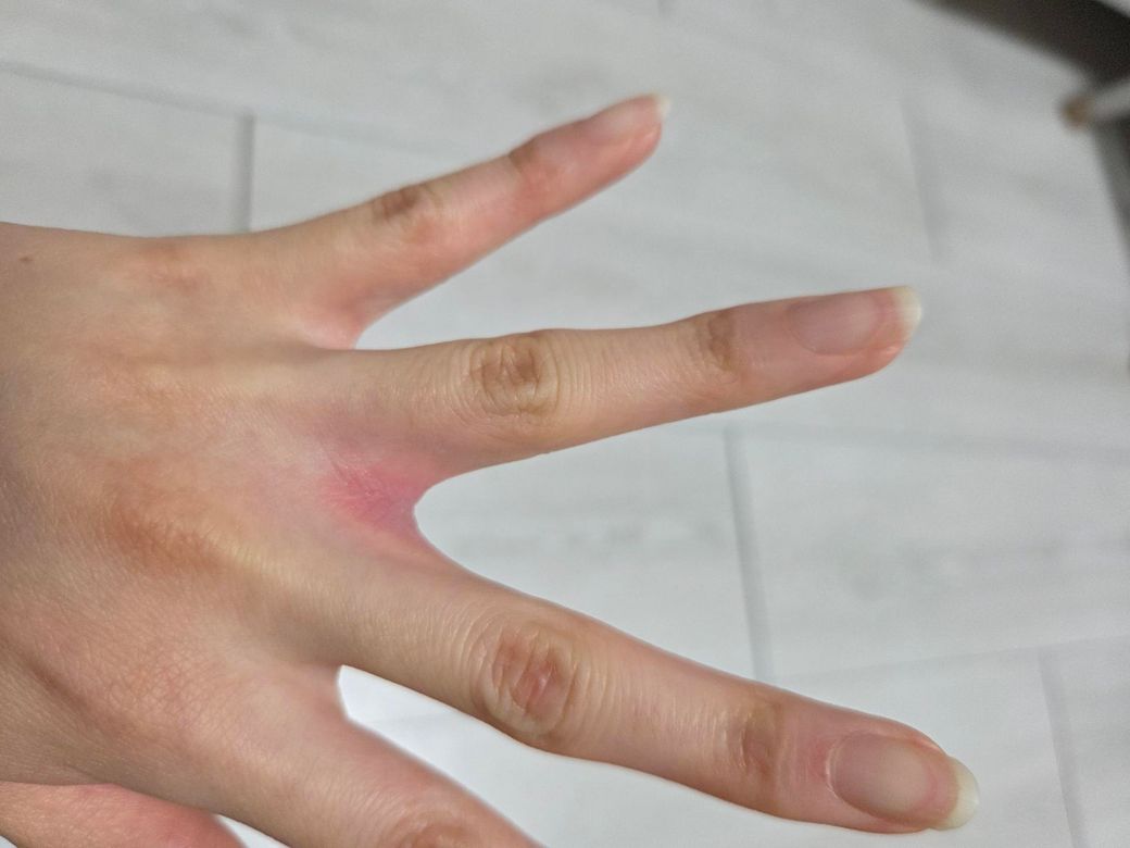 사진상 중지와 약지 사이에 국소적인 홍반과 약간의 부종이 보이며, 피부가 보라색으로 변색된 괴사 소견(검게 변하거나 감각이 소실되는 양상)은 보이지 않습니다. 괴사는 보통 검은색 또는 짙은 갈색으로 변하며, 통증이 심하거나 오히려 감각이 둔해지는 특징이 있습니다. 현재 사진은 그 양상과는 다릅니다.