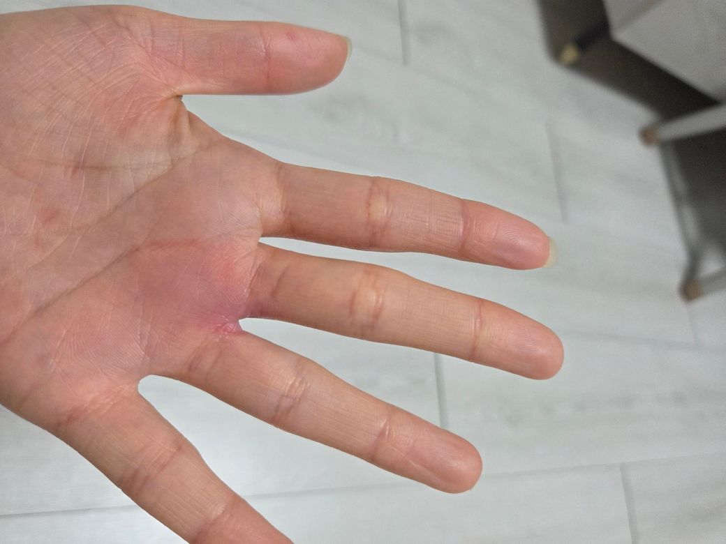 가려움으로 시작했고, 접히는 부위가 단단하게 느껴진다면 다음 가능성이 더 높습니다. 첫째, 접촉성 피부염 또는 습진입니다. 손가락 사이(interdigital area)는 습기와 마찰로 염증이 잘 생깁니다. 둘째, 초기 세균성 피부염(cellulitis) 또는 국소 감염 가능성입니다. 이 경우 점차 붉어지고 통증과 열감이 증가합니다. 셋째, 드물지만 한랭 노출 후 발생하는 동창(pernio)도 보라색 변화를 보일 수 있습니다.