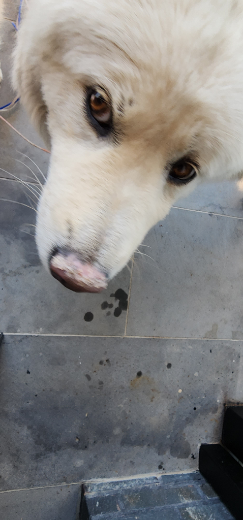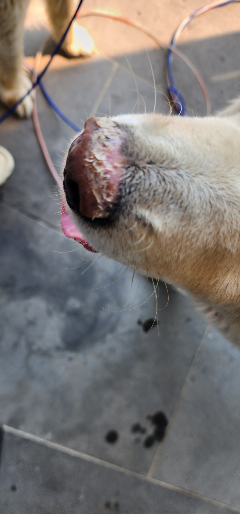 풍산, 진도, 아키다와 같은 동북아 품종의 경우 광감작성 피부병증 이나 천포창과 같은 면역계 질환으로 콧잔등에 사진과 같은 병변이 생기는 경우가 많습니다.