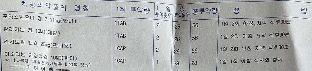 현재 복용중인 포타스틴오디정과 베포텍정은 동일한 성분으로 한가지만 복용하는 것이 거ㅜㄴ장되며