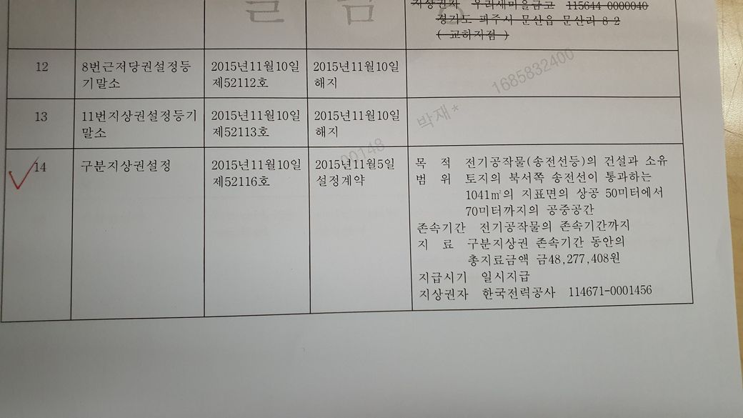 지상권 1 질문) 이물건을 경락받을 경우 지상권1이 말소되지 않고 매수인이 인수된다고 하는데, 이때 제가 한전으로부터 지료를 받을 수 있는지요? 등기상에는 2015년 11월에 지상권이 설정되었으며 송전선의 존속기간 동안의 지료가 약 4,800만원으로 명시되었습니다.