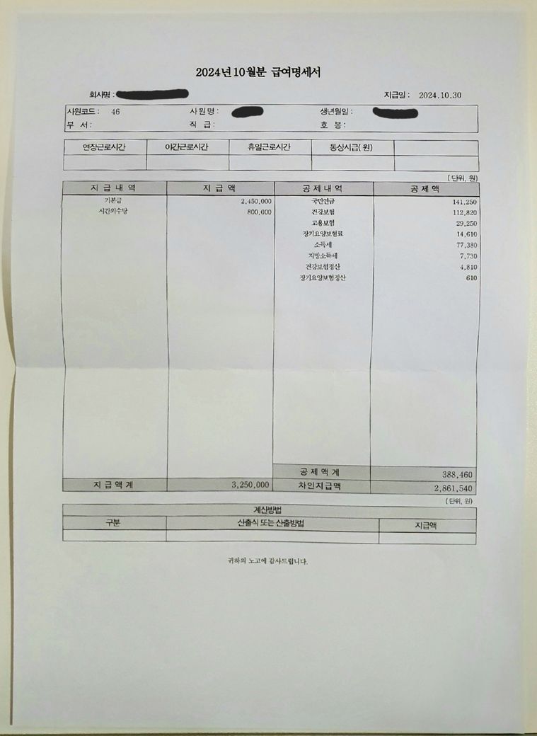 10월 급여명세서고 상여금 보너스 추가수당 이런거 없이 24년 12달 전부 저 명세서입니다 세전 325만 세후 2861540원
