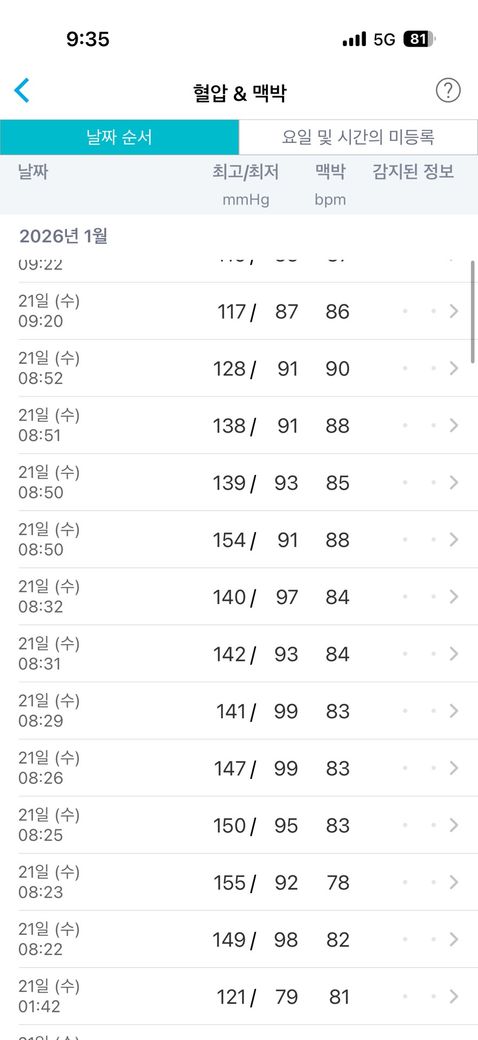 결론적으로, 현재 기록상으로는 아침 평균 혈압은 120–130대 범위로 해석되며, 처음 150이 나온 것은 불안 반응으로 보는 것이 보수적인 판단입니다. 혈압은 “불안한 상태에서 잰 첫 수치”를 스스로 의미 있게 해석하지 않는 것이 중요합니다.
