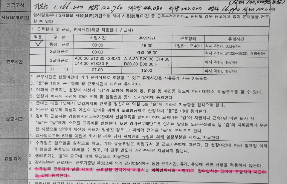 2014년 첫 계약 당시 월급170만원으로 구두 합의 후 임금구성 항목이 공란이었던 근로계약서에 서명했습니다. 해당 임금구성 항목의 공란은 근로계약서 작성 후 용역회사에서 임의적으로 기재한 것으로 확인됐습니다.